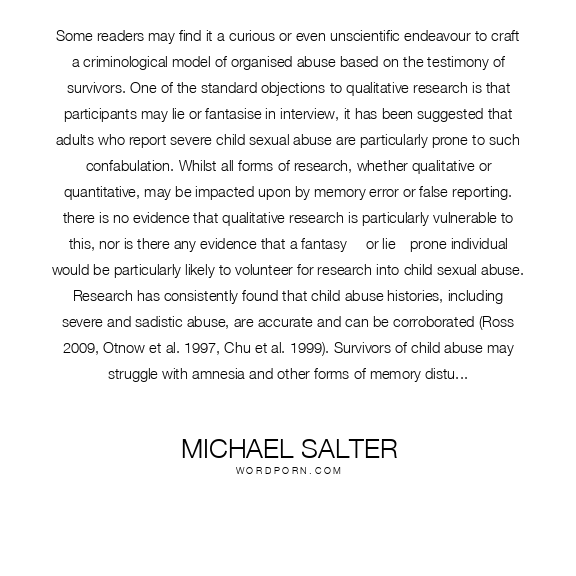 Some readers may find it a curious or even unscientific endeavour to craft a criminological model of organised abuse based on the testimony of survivors. One of the standard objections to qualitative research is that participants may lie or fantasise in interview, it has been suggested that adults who report severe child sexual abuse are particularly prone to such confabulation. Whilst all forms of research, whether qualitative or quantitative, may be impacted upon by memory error or false reporting. there is no evidence that qualitative research is particularly vulnerable to this, nor is there any evidence that a fantasy— or lie—prone individual would be particularly likely to volunteer for research into child sexual abuse. Research has consistently found that child abuse histories, including severe and sadistic abuse, are accurate and can be corroborated (Ross 2009, Otnow et al. 1997, Chu et al. 1999). Survivors of child abuse may struggle with amnesia and other forms of memory disturbance but the notion that they are particularly prone to suggestion and confabulation has yet to find a scientific basis. It is interesting to note that questions about the veracity of eyewitness evidence appear to be asked far more frequently in relation to sexual abuse and rape than in relation to other crimes. The research on which this book is based has been conducted with an ethical commitment to taking the lives and voices of survivors of organised abuse seriously