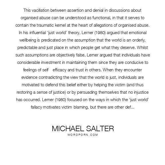 This vacillation between assertion and denial in discussions about organised abuse can be understood as functional, in that it serves to contain the traumatic kernel at the heart of allegations of organised abuse. In his influential ‘just world’ theory, Lerner (1980) argued that emotional wellbeing is predicated on the assumption that the world is an orderly, predictable and just place in which people get what they deserve. Whilst such assumptions are objectively false, Lerner argued that individuals have considerable investment in maintaining them since they are conducive to feelings of self—efficacy and trust in others. When they encounter evidence contradicting the view that the world is just, individuals are motivated to defend this belief either by helping the victim (and thus restoring a sense of justice) or by persuading themselves that no injustice has occurred. Lerner (1980) focused on the ways in which the ‘just world’ fallacy motivates victim-blaming, but there are other defences available to bystanders who seek to dispel troubling knowledge. Organised abuse highlights the severity of sexual violence in the lives of some children and the desire of some adults to inflict considerable, and sometimes irreversible, harm upon the powerless. Such knowledge is so toxic to common presumptions about the orderly nature of society, and the generally benevolent motivations of others, that it seems as though a defensive scaffold of disbelief, minimisation and scorn has been erected to inhibit a full understanding of organised abuse. Despite these efforts, there has been a recent resurgence of interest in organised abuse and particularly ritualistic abuse (eg Sachs and Galton 2008, Epstein et al. 2011, Miller 2012)