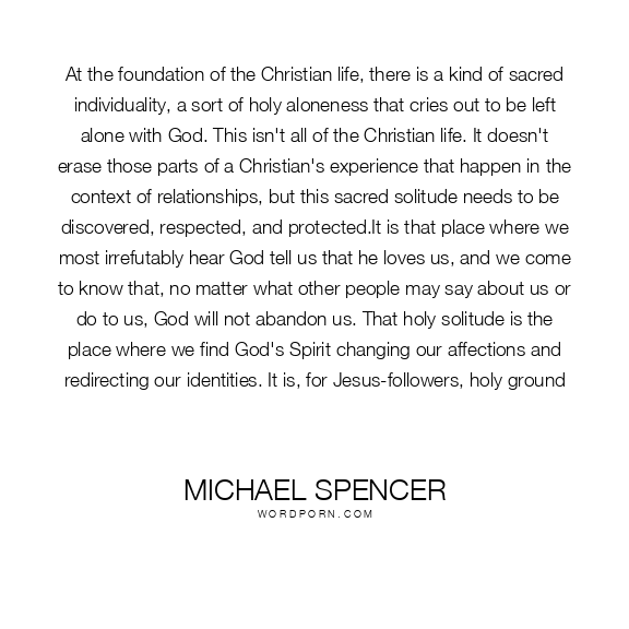At the foundation of the Christian life, there is a kind of sacred individuality, a sort of holy aloneness that cries out to be left alone with God. This isn't all of the Christian life. It doesn't erase those parts of a Christian's experience that happen in the context of relationships, but this sacred solitude needs to be discovered, respected, and protected.It is that place where we most irrefutably hear God tell us that he loves us, and we come to know that, no matter what other people may say about us or do to us, God will not abandon us. That holy solitude is the place where we find God's Spirit changing our affections and redirecting our identities. It is, for Jesus-followers, holy ground