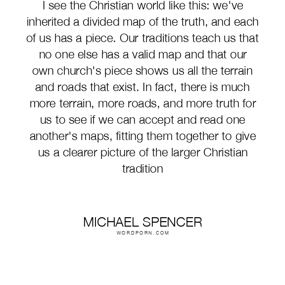 I see the Christian world like this: we've inherited a divided map of the truth, and each of us has a piece. Our traditions teach us that no one else has a valid map and that our own church's piece shows us all the terrain and roads that exist. In fact, there is much more terrain, more roads, and more truth for us to see if we can accept and read one another's maps, fitting them together to give us a clearer picture of the larger Christian tradition