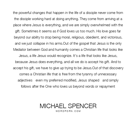 the powerful changes that happen in the life of a disciple never come from the disciple working hard at doing anything. They come from arriving at a place where Jesus is everything, and we are simply overwhelmed with the gift. Sometimes it seems as if God loves us too much. His love goes far beyond our ability to stop being moral, religious, obedient, and victorious, and we just collapse in his arms.Out of the gospel that Jesus is the only Mediator between God and humanity comes a Christian life that looks like Jesus, a life Jesus would recognize. It's a life that looks like Jesus, because Jesus does everything, and all we do is accept his gift. And to accept his gift, we have to give up trying to be Jesus.Out of that discovery comes a Christian life that is free from the tyranny of unnecessary adjectives - even my preferred modified, Jesus-shaped - and simply follows after the One who loves us beyond words or repayment