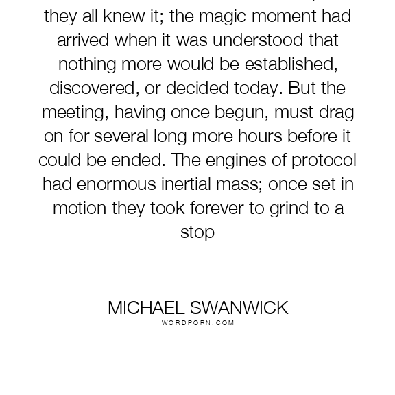 Their business here was over then, and they all knew it; the magic moment had arrived when it was understood that nothing more would be established, discovered, or decided today. But the meeting, having once begun, must drag on for several long more hours before it could be ended. The engines of protocol had enormous inertial mass; once set in motion they took forever to grind to a stop