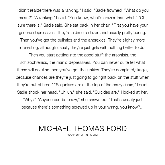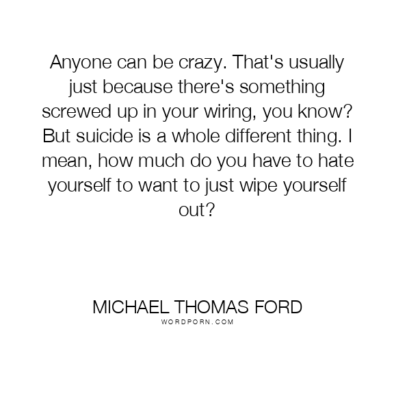 Anyone can be crazy. That's usually just because there's something screwed up in your wiring, you know? But suicide is a whole different thing. I mean, how much do you have to hate yourself to want to just wipe yourself out?