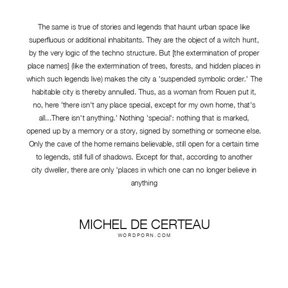 The same is true of stories and legends that haunt urban space like superfluous or additional inhabitants. They are the object of a witch-hunt, by the very logic of the techno-structure. But [the extermination of proper place names] (like the extermination of trees, forests, and hidden places in which such legends live) makes the city a 'suspended symbolic order.' The habitable city is thereby annulled. Thus, as a woman from Rouen put it, no, here 'there isn't any place special, except for my own home, that's all...There isn't anything.' Nothing 'special': nothing that is marked, opened up by a memory or a story, signed by something or someone else. Only the cave of the home remains believable, still open for a certain time to legends, still full of shadows. Except for that, according to another city-dweller, there are only 'places in which one can no longer believe in anything