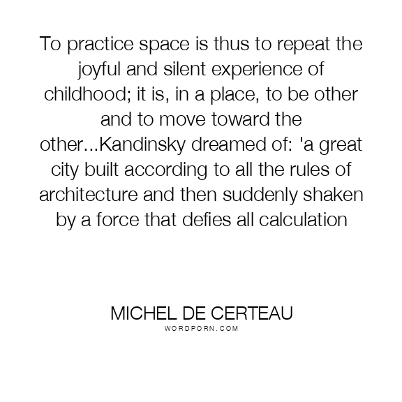 To practice space is thus to repeat the joyful and silent experience of childhood; it is, in a place, to be other and to move toward the other...Kandinsky dreamed of: 'a great city built according to all the rules of architecture and then suddenly shaken by a force that defies all calculation