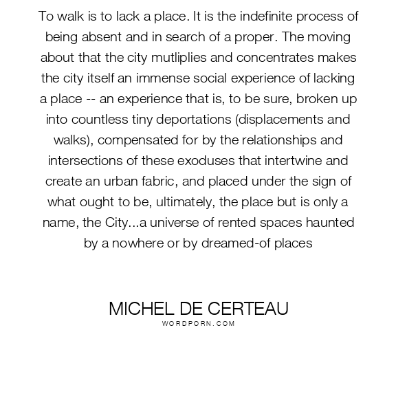 To walk is to lack a place. It is the indefinite process of being absent and in search of a proper. The moving about that the city mutliplies and concentrates makes the city itself an immense social experience of lacking a place -- an experience that is, to be sure, broken up into countless tiny deportations (displacements and walks), compensated for by the relationships and intersections of these exoduses that intertwine and create an urban fabric, and placed under the sign of what ought to be, ultimately, the place but is only a name, the City...a universe of rented spaces haunted by a nowhere or by dreamed-of places