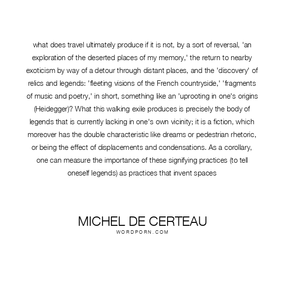 what does travel ultimately produce if it is not, by a sort of reversal, 'an exploration of the deserted places of my memory,' the return to nearby exoticism by way of a detour through distant places, and the 'discovery' of relics and legends: 'fleeting visions of the French countryside,' 'fragments of music and poetry,' in short, something like an 'uprooting in one's origins (Heidegger)? What this walking exile produces is precisely the body of legends that is currently lacking in one's own vicinity; it is a fiction, which moreover has the double characteristic like dreams or pedestrian rhetoric, or being the effect of displacements and condensations. As a corollary, one can measure the importance of these signifying practices (to tell oneself legends) as practices that invent spaces