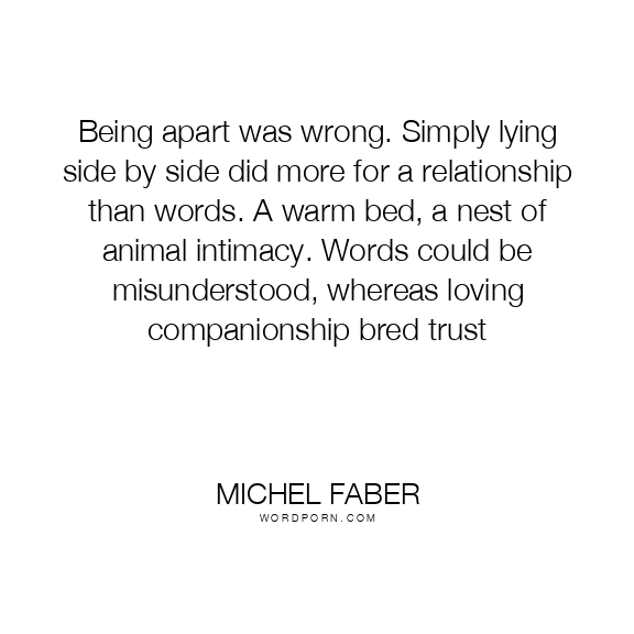 Being apart was wrong. Simply lying side by side did more for a relationship than words. A warm bed, a nest of animal intimacy. Words could be misunderstood, whereas loving companionship bred trust
