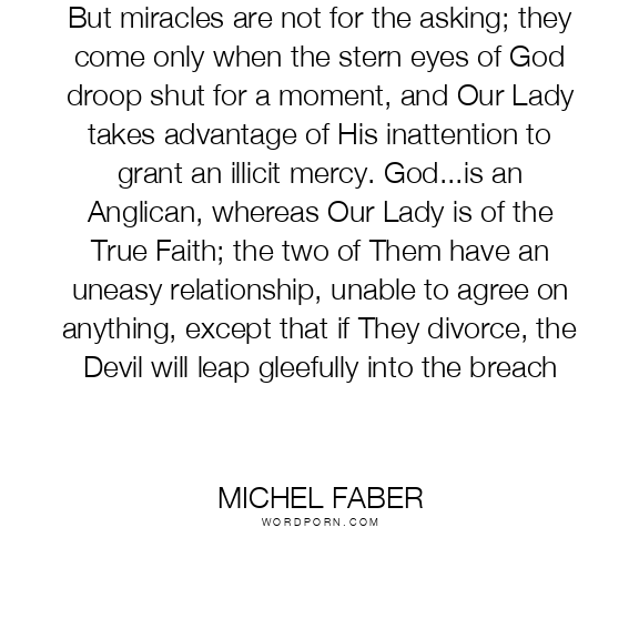 But miracles are not for the asking; they come only when the stern eyes of God droop shut for a moment, and Our Lady takes advantage of His inattention to grant an illicit mercy. God...is an Anglican, whereas Our Lady is of the True Faith; the two of Them have an uneasy relationship, unable to agree on anything, except that if They divorce, the Devil will leap gleefully into the breach