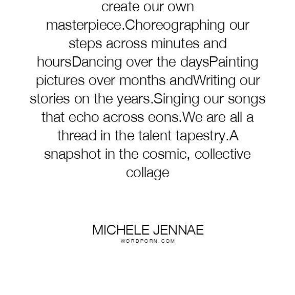 On the great canvas of timeWe all create our own masterpiece.Choreographing our steps across minutes and hoursDancing over the daysPainting pictures over months andWriting our stories on the years.Singing our songs that echo across eons.We are all a thread in the talent tapestry.A snapshot in the cosmic, collective collage