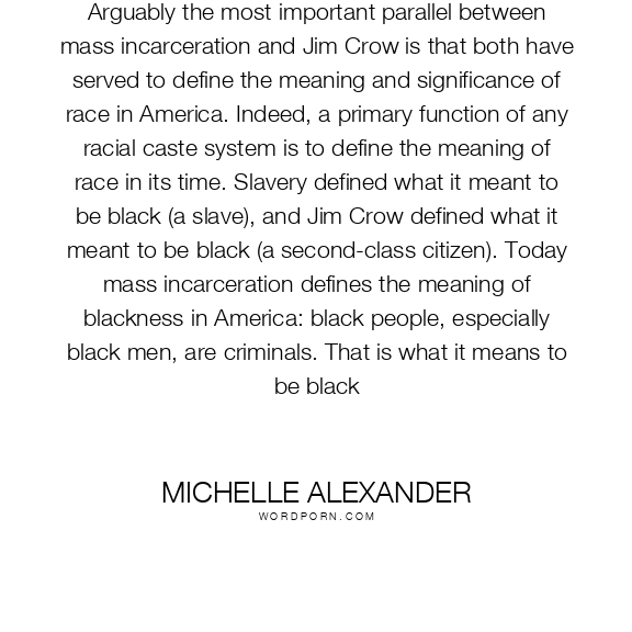 Arguably the most important parallel between mass incarceration and Jim Crow is that both have served to define the meaning and significance of race in America. Indeed, a primary function of any racial caste system is to define the meaning of race in its time. Slavery defined what it meant to be black (a slave), and Jim Crow defined what it meant to be black (a second-class citizen). Today mass incarceration defines the meaning of blackness in America: black people, especially black men, are criminals. That is what it means to be black