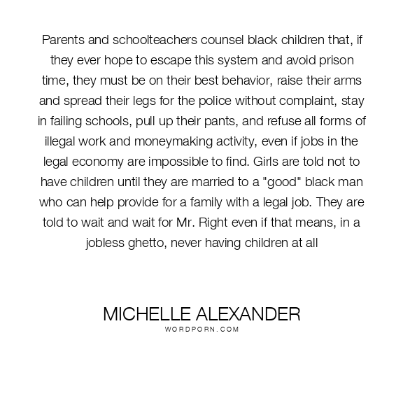 Parents and schoolteachers counsel black children that, if they ever hope to escape this system and avoid prison time, they must be on their best behavior, raise their arms and spread their legs for the police without complaint, stay in failing schools, pull up their pants, and refuse all forms of illegal work and moneymaking activity, even if jobs in the legal economy are impossible to find. Girls are told not to have children until they are married to a "good" black man who can help provide for a family with a legal job. They are told to wait and wait for Mr. Right even if that means, in a jobless ghetto, never having children at all