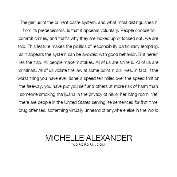 The genius of the current caste system, and what most distinguishes it from its predecessors, is that it appears voluntary. People choose to commit crimes, and that's why they are locked up or locked out, we are told. This feature makes the politics of responsibility particularly tempting, as it appears the system can be avoided with good behavior. But herein lies the trap. All people make mistakes. All of us are sinners. All of us are criminals. All of us violate the law at some point in our lives. In fact, if the worst thing you have ever done is speed ten miles over the speed limit on the freeway, you have put yourself and others at more risk of harm than someone smoking marijuana in the privacy of his or her living room. Yet there are people in the United States serving life sentences for first-time drug offenses, something virtually unheard of anywhere else in the world
