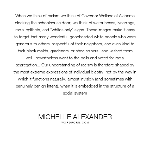 When we think of racism we think of Governor Wallace of Alabama blocking the schoolhouse door; we think of water hoses, lynchings, racial epithets, and "whites only" signs. These images make it easy to forget that many wonderful, goodhearted white people who were generous to others, respectful of their neighbors, and even kind to their black maids, gardeners, or shoe shiners--and wished them well--nevertheless went to the polls and voted for racial segregation... Our understanding of racism is therefore shaped by the most extreme expressions of individual bigotry, not by the way in which it functions naturally, almost invisibly (and sometimes with genuinely benign intent), when it is embedded in the structure of a social system
