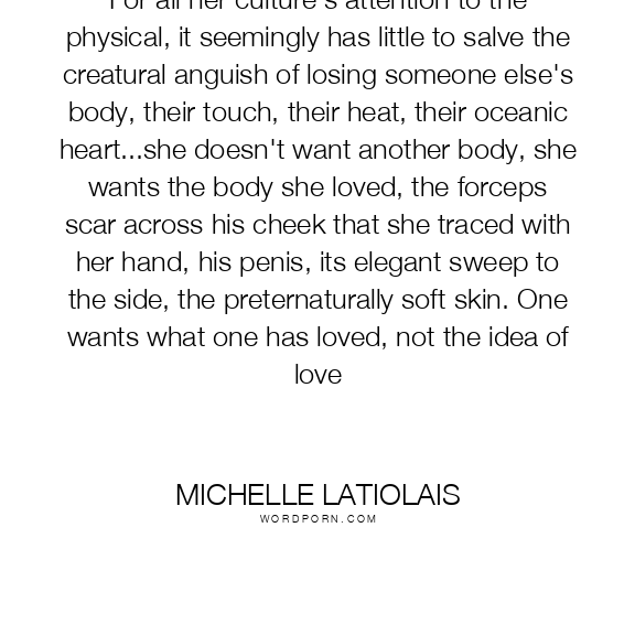 For all her culture's attention to the physical, it seemingly has little to salve the creatural anguish of losing someone else's body, their touch, their heat, their oceanic heart...she doesn't want another body, she wants the body she loved, the forceps scar across his cheek that she traced with her hand, his penis, its elegant sweep to the side, the preternaturally soft skin. One wants what one has loved, not the idea of love