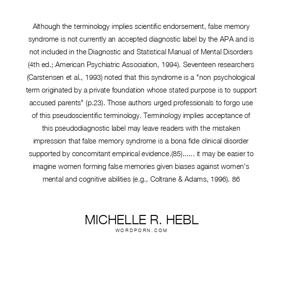 Although the terminology implies scientific endorsement, false memory syndrome is not currently an accepted diagnostic label by the APA and is not included in the Diagnostic and Statistical Manual of Mental Disorders (4th ed.; American Psychiatric Association, 1994). Seventeen researchers (Carstensen et al., 1993) noted that this syndrome is a "non-psychological term originated by a private foundation whose stated purpose is to support accused parents" (p.23). Those authors urged professionals to forgo use of this pseudoscientific terminology. Terminology implies acceptance of this pseudodiagnostic label may leave readers with the mistaken impression that false memory syndrome is a bona fide clinical disorder supported by concomitant empirical evidence.(85)...... it may be easier to imagine women forming false memories given biases against women's mental and cognitive abilities (e.g., Coltrane & Adams, 1996). 86