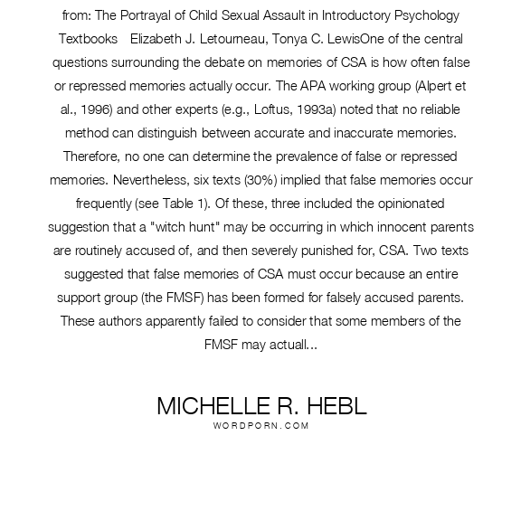 from: The Portrayal of Child Sexual Assault in Introductory Psychology Textbooks - Elizabeth J. Letourneau, Tonya C. LewisOne of the central questions surrounding the debate on memories of CSA is how often false or repressed memories actually occur. The APA working group (Alpert et al., 1996) and other experts (e.g., Loftus, 1993a) noted that no reliable method can distinguish between accurate and inaccurate memories. Therefore, no one can determine the prevalence of false or repressed memories. Nevertheless, six texts (30%) implied that false memories occur frequently (see Table 1). Of these, three included the opinionated suggestion that a "witch hunt" may be occurring in which innocent parents are routinely accused of, and then severely punished for, CSA. Two texts suggested that false memories of CSA must occur because an entire support group (the FMSF) has been formed for falsely accused parents. These authors apparently failed to consider that some members of the FMSF may actually have sexually assaulted children but are motivated to appear innocent. (85)