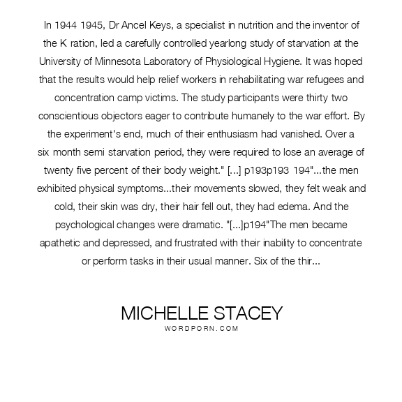 Michelle Stacey quote. In 1944-1945, Dr Ancel Keys, a specialist in nutrition and the inventor of the K-ration, led a carefully controlled yearlong study of starvation at the University of Minnesota Laboratory of Physiological Hygiene. It was hoped that the results would help relief workers in rehabilitating war refugees and concentration camp victims. The study participants were thirty-two conscientious objectors eager to contribute humanely to the war effort. By the experiment's end, much of their enthusiasm had vanished. Over a six-month semi-starvation period, they were required to lose an average of twenty-five percent of their body weight.