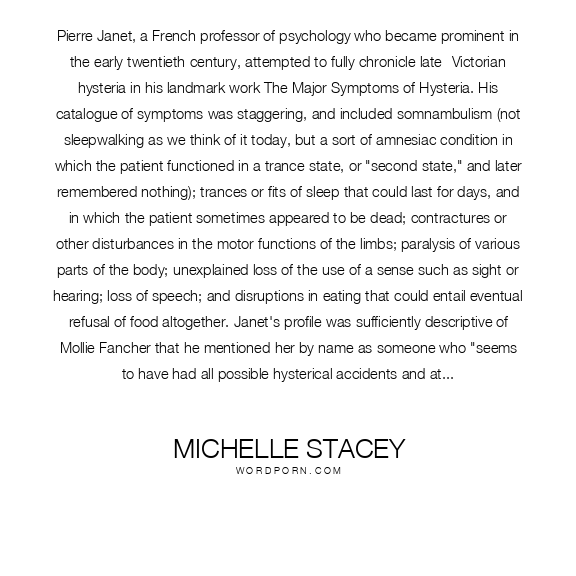 Michelle Stacey quote. Pierre Janet, a French professor of psychology who became prominent in the early twentieth century, attempted to fully chronicle late- Victorian hysteria in his landmark work The Major Symptoms of Hysteria. His catalogue of symptoms was staggering, and included somnambulism (not sleepwalking as we think of it today, but a sort of amnesiac condition in which the patient functioned in a trance state, or