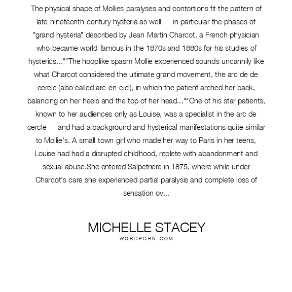 Michelle Stacey quote. The physical shape of Mollies paralyses and contortions fit the pattern of late-nineteenth-century hysteria as well — in particular the phases of