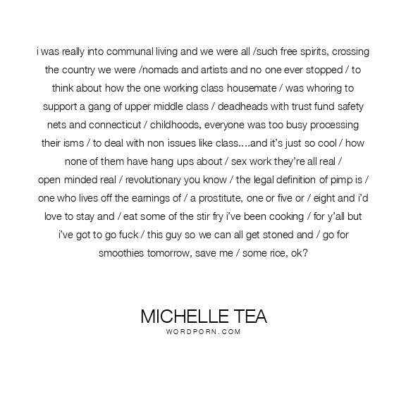 i was really into communal living and we were all /such free spirits, crossing the country we were /nomads and artists and no one ever stopped / to think about how the one working class housemate / was whoring to support a gang of upper middle class / deadheads with trust fund safety nets and connecticut / childhoods, everyone was too busy processing their isms / to deal with non-issues like class....and it’s just so cool / how none of them have hang-ups about / sex work they’re all real / open-minded real / revolutionary you know / the legal definition of pimp is / one who lives off the earnings of / a prostitute, one or five or / eight and i’d love to stay and / eat some of the stir fry i’ve been cooking / for y’all but i’ve got to go fuck / this guy so we can all get stoned and / go for smoothies tomorrow, save me / some rice, ok?