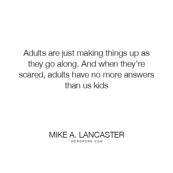 Mike A. Lancaster quote. Adults are just making things up as they go along. And when they’re scared, adults have no more answers than us kids