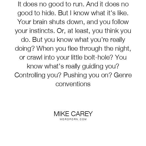 It does no good to run. And it does no good to hide. But I know what it's like. Your brain shuts down, and you follow your instincts. Or, at least, you think you do. But you know what you're really doing? When you flee through the night, or crawl into your little bolt-hole? You know what's really guiding you? Controlling you? Pushing you on? Genre conventions