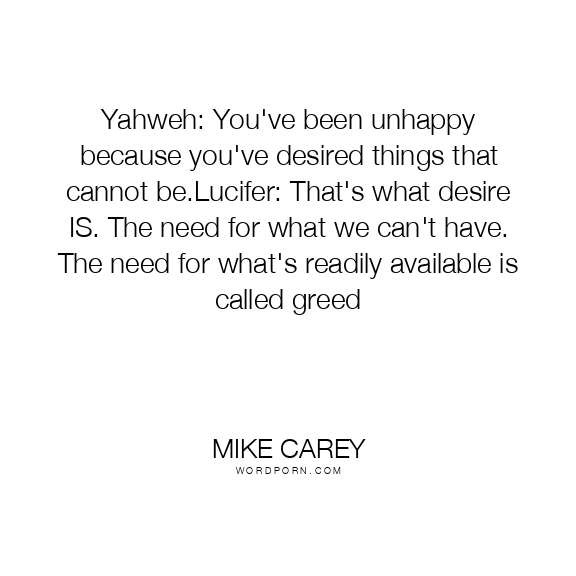 Yahweh: You've been unhappy because you've desired things that cannot be.Lucifer: That's what desire IS. The need for what we can't have. The need for what's readily available is called greed