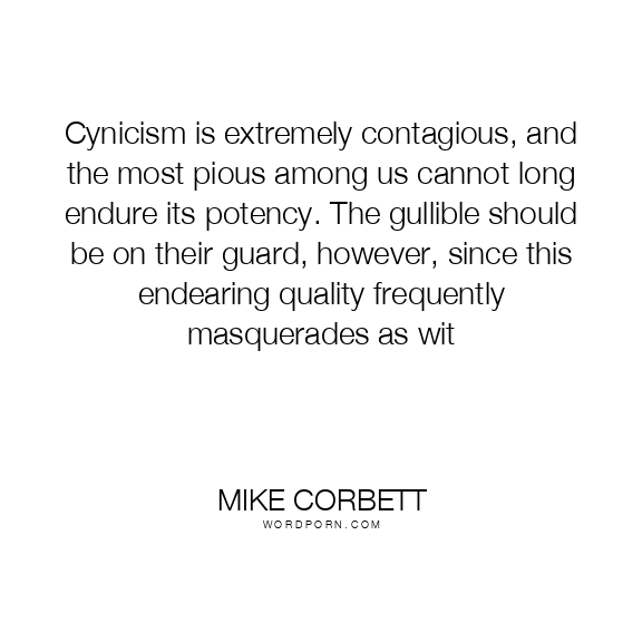 Cynicism is extremely contagious, and the most pious among us cannot long endure its potency. The gullible should be on their guard, however, since this endearing quality frequently masquerades as wit