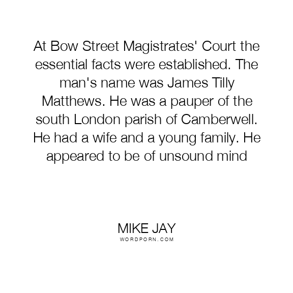 At Bow Street Magistrates' Court the essential facts were established. The man's name was James Tilly Matthews. He was a pauper of the south London parish of Camberwell. He had a wife and a young family. He appeared to be of unsound mind