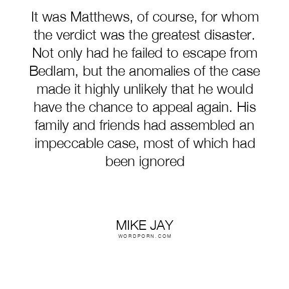 It was Matthews, of course, for whom the verdict was the greatest disaster. Not only had he failed to escape from Bedlam, but the anomalies of the case made it highly unlikely that he would have the chance to appeal again. His family and friends had assembled an impeccable case, most of which had been ignored