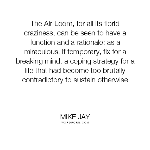 The Air Loom, for all its florid craziness, can be seen to have a function and a rationale: as a miraculous, if temporary, fix for a breaking mind, a coping strategy for a life that had become too brutally contradictory to sustain otherwise