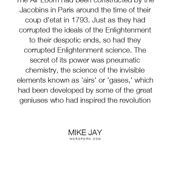 The Air Loom had been constructed by the Jacobins in Paris around the time of their coup d'etat in 1793. Just as they had corrupted the ideals of the Enlightenment to their despotic ends, so had they corrupted Enlightenment science. The secret of its power was pneumatic chemistry, the science of the invisible elements known as 'airs' or 'gases,' which had been developed by some of the great geniuses who had inspired the revolution