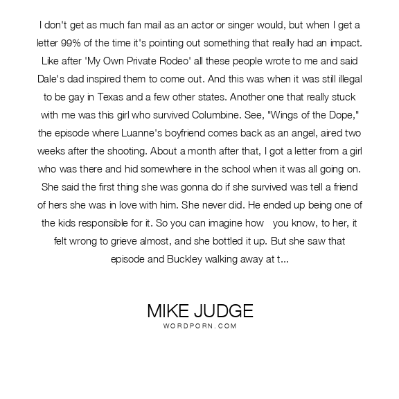 I don't get as much fan mail as an actor or singer would, but when I get a letter 99% of the time it's pointing out something that really had an impact. Like after 'My Own Private Rodeo' all these people wrote to me and said Dale's dad inspired them to come out. And this was when it was still illegal to be gay in Texas and a few other states. Another one that really stuck with me was this girl who survived Columbine. See, "Wings of the Dope," the episode where Luanne's boyfriend comes back as an angel, aired two weeks after the shooting. About a month after that, I got a letter from a girl who was there and hid somewhere in the school when it was all going on. She said the first thing she was gonna do if she survived was tell a friend of hers she was in love with him. She never did. He ended up being one of the kids responsible for it. So you can imagine how - you know, to her, it felt wrong to grieve almost, and she bottled it up. But she saw that episode and Buckley walking away at the end and something just let her finally break down and greive and miss the guy. I remember she quoted Luanne - 'I wonder if he's guardianing some other girl,' or something along that line, because she never had the guts to tell the kid. That really gets to people at Comic Con