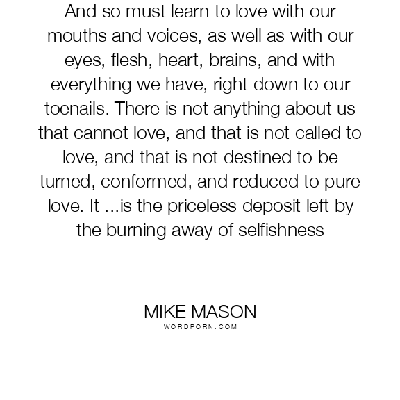 And so must learn to love with our mouths and voices, as well as with our eyes, flesh, heart, brains, and with everything we have, right down to our toenails. There is not anything about us that cannot love, and that is not called to love, and that is not destined to be turned, conformed, and reduced to pure love. It ...is the priceless deposit left by the burning away of selfishness
