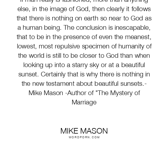 If man really is fashioned, more than anything else, in the image of God, then clearly it follows that there is nothing on earth so near to God as a human being. The conclusion is inescapable, that to be in the presence of even the meanest, lowest, most repulsive specimen of humanity of the world is still to be closer to God than when looking up into a starry sky or at a beautiful sunset. Certainly that is why there is nothing in the new testament about beautiful sunsets.- Mike Mason -Author of "The Mystery of Marriage