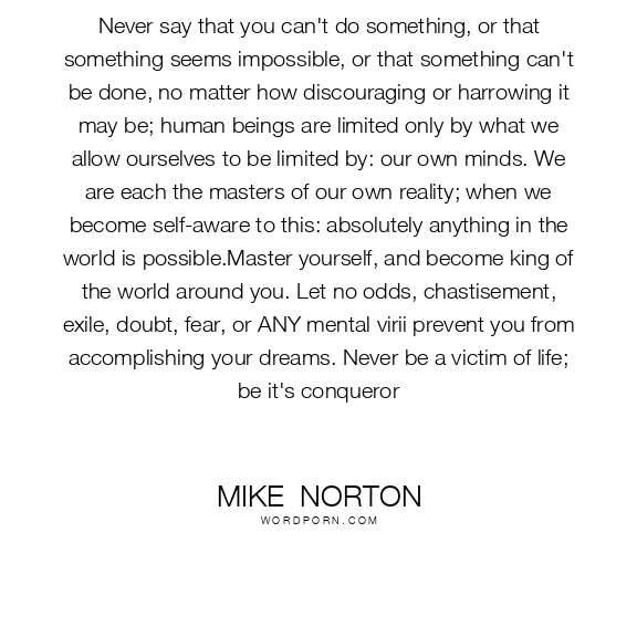 Never say that you can't do something, or that something seems impossible, or that something can't be done, no matter how discouraging or harrowing it may be; human beings are limited only by what we allow ourselves to be limited by: our own minds. We are each the masters of our own reality; when we become self-aware to this: absolutely anything in the world is possible.Master yourself, and become king of the world around you. Let no odds, chastisement, exile, doubt, fear, or ANY mental virii prevent you from accomplishing your dreams. Never be a victim of life; be it's conqueror