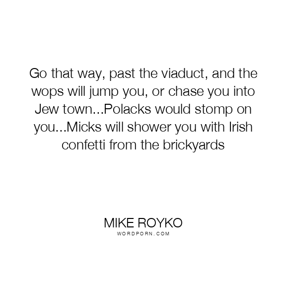Go that way, past the viaduct, and the wops will jump you, or chase you into Jew town...Polacks would stomp on you...Micks will shower you with Irish confetti from the brickyards