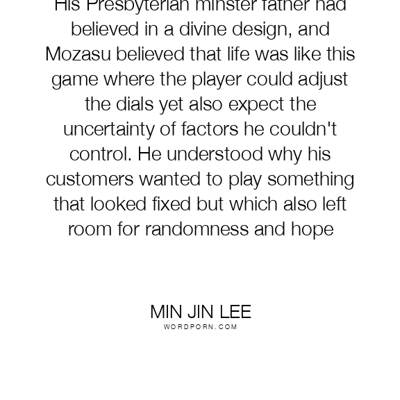 His Presbyterian minster father had believed in a divine design, and Mozasu believed that life was like this game where the player could adjust the dials yet also expect the uncertainty of factors he couldn't control. He understood why his customers wanted to play something that looked fixed but which also left room for randomness and hope