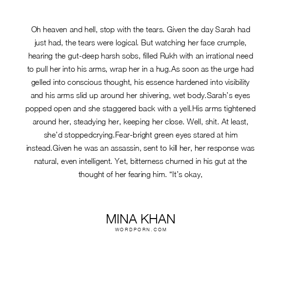 Oh heaven and hell, stop with the tears. Given the day Sarah had just had, the tears were logical. But watching her face crumple, hearing the gut-deep harsh sobs, filled Rukh with an irrational need to pull her into his arms, wrap her in a hug.As soon as the urge had gelled into conscious thought, his essence hardened into visibility and his arms slid up around her shivering, wet body.Sarah’s eyes popped open and she staggered back with a yell.His arms tightened around her, steadying her, keeping her close. Well, shit. At least, she’d stoppedcrying.Fear-bright green eyes stared at him instead.Given he was an assassin, sent to kill her, her response was natural, even intelligent. Yet, bitterness churned in his gut at the thought of her fearing him. “It’s okay,
