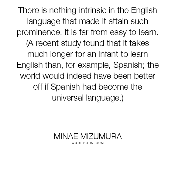 Minae Mizumura quote. There is nothing intrinsic in the English language that made it attain such prominence. It is far from easy to learn. (A recent study found that it takes much longer for an infant to learn English than, for example, Spanish; the world would indeed have been better off if Spanish had become the universal language.)