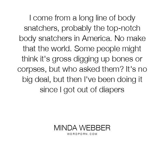 I come from a long line of body snatchers, probably the top-notch body snatchers in America. No make that the world. Some people might think it's gross digging up bones or corpses, but who asked them? It's no big deal, but then I've been doing it since I got out of diapers
