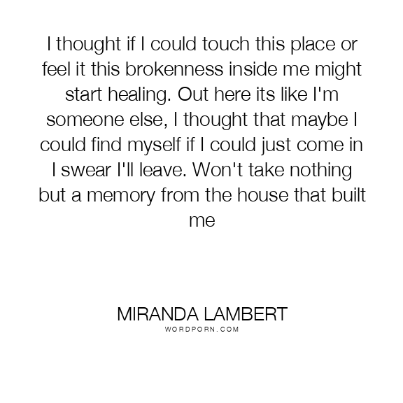 I thought if I could touch this place or feel it this brokenness inside me might start healing. Out here its like I'm someone else, I thought that maybe I could find myself if I could just come in I swear I'll leave. Won't take nothing but a memory from the house that built me