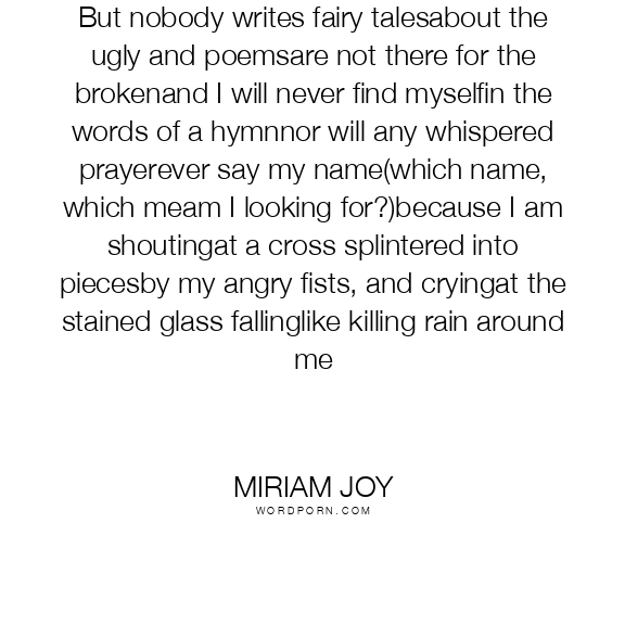 But nobody writes fairy talesabout the ugly and poemsare not there for the brokenand I will never find myselfin the words of a hymnnor will any whispered prayerever say my name(which name, which meam I looking for?)because I am shoutingat a cross splintered into piecesby my angry fists, and cryingat the stained glass fallinglike killing rain around me