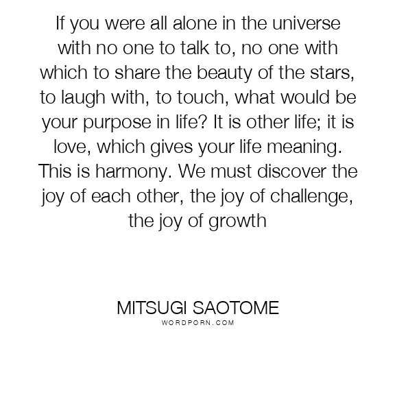 If you were all alone in the universe with no one to talk to, no one with which to share the beauty of the stars, to laugh with, to touch, what would be your purpose in life? It is other life; it is love, which gives your life meaning. This is harmony. We must discover the joy of each other, the joy of challenge, the joy of growth