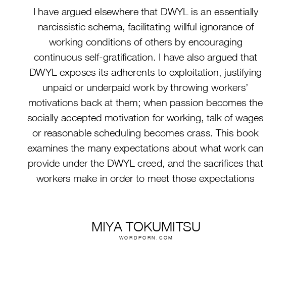 I have argued elsewhere that DWYL is an essentially narcissistic schema, facilitating willful ignorance of working conditions of others by encouraging continuous self-gratification. I have also argued that DWYL exposes its adherents to exploitation, justifying unpaid or underpaid work by throwing workers’ motivations back at them; when passion becomes the socially accepted motivation for working, talk of wages or reasonable scheduling becomes crass. This book examines the many expectations about what work can provide under the DWYL creed, and the sacrifices that workers make in order to meet those expectations