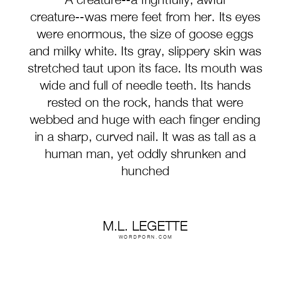 A creature--a frightfully, awful creature--was mere feet from her. Its eyes were enormous, the size of goose eggs and milky white. Its gray, slippery skin was stretched taut upon its face. Its mouth was wide and full of needle teeth. Its hands rested on the rock, hands that were webbed and huge with each finger ending in a sharp, curved nail. It was as tall as a human man, yet oddly shrunken and hunched