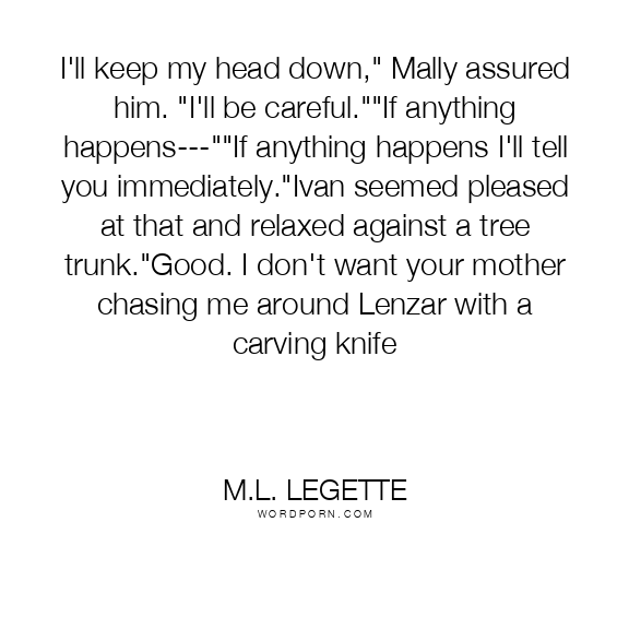 I'll keep my head down," Mally assured him. "I'll be careful.""If anything happens---""If anything happens I'll tell you immediately."Ivan seemed pleased at that and relaxed against a tree trunk."Good. I don't want your mother chasing me around Lenzar with a carving knife