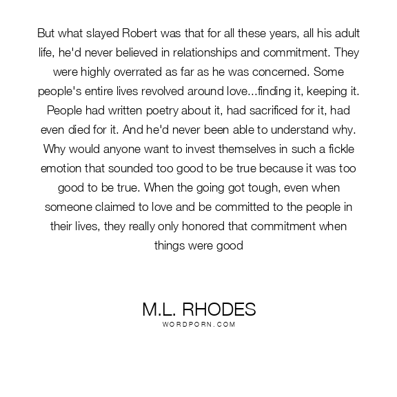But what slayed Robert was that for all these years, all his adult life, he'd never believed in relationships and commitment. They were highly overrated as far as he was concerned. Some people's entire lives revolved around love...finding it, keeping it. People had written poetry about it, had sacrificed for it, had even died for it. And he'd never been able to understand why. Why would anyone want to invest themselves in such a fickle emotion that sounded too good to be true because it was too good to be true. When the going got tough, even when someone claimed to love and be committed to the people in their lives, they really only honored that commitment when things were good