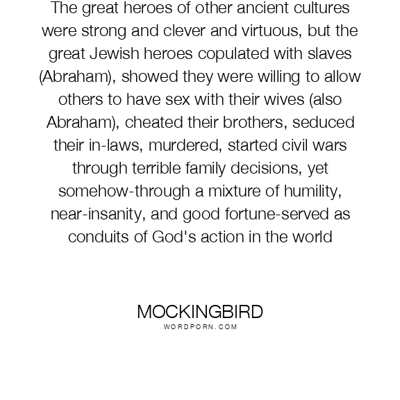 The great heroes of other ancient cultures were strong and clever and virtuous, but the great Jewish heroes copulated with slaves (Abraham), showed they were willing to allow others to have sex with their wives (also Abraham), cheated their brothers, seduced their in-laws, murdered, started civil wars through terrible family decisions, yet somehow-through a mixture of humility, near-insanity, and good fortune-served as conduits of God's action in the world
